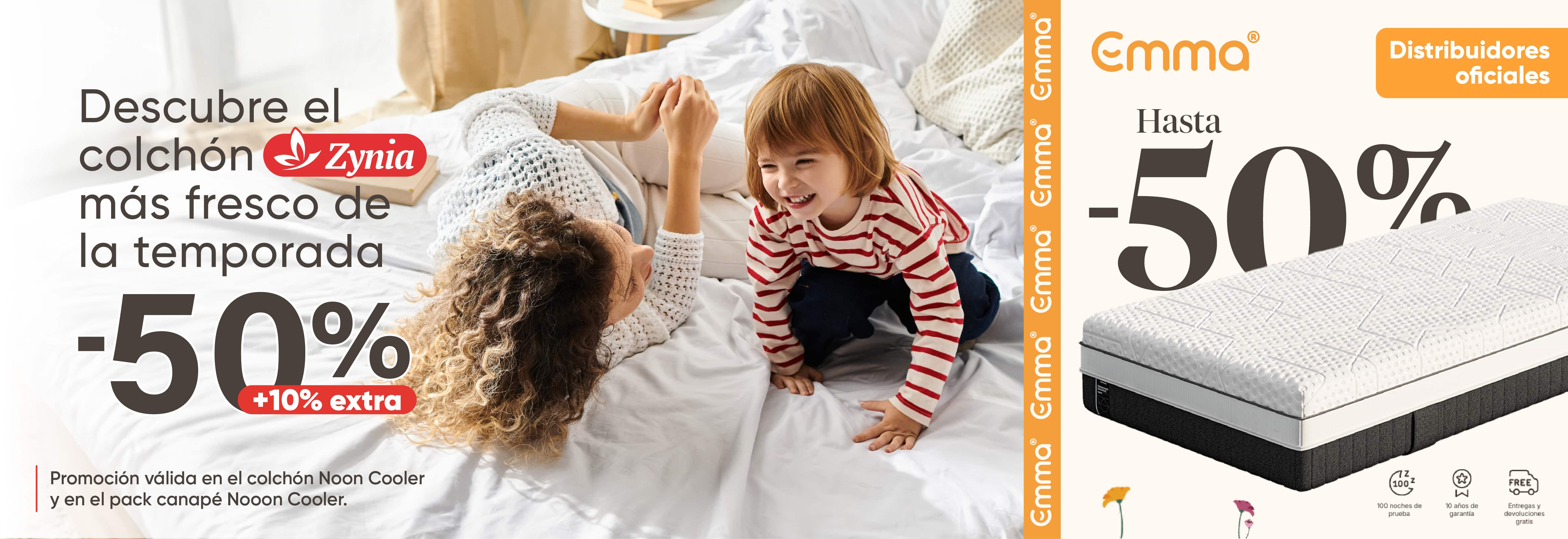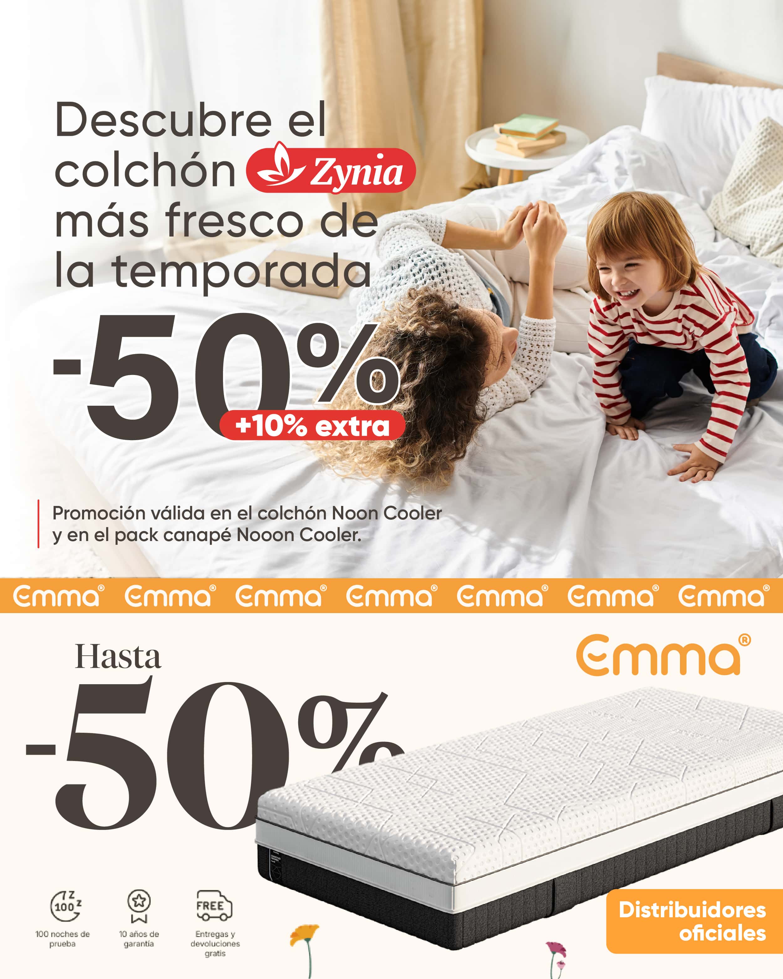Aprovecha los descuentos de primavera y consigue hasta un 50% + 10% adicional en colchones y packs canapé Zynia seleccionados, hasta un 70% de descuento en el Pack Berlín y hasta un 50% en colchones y almohadas Emma.