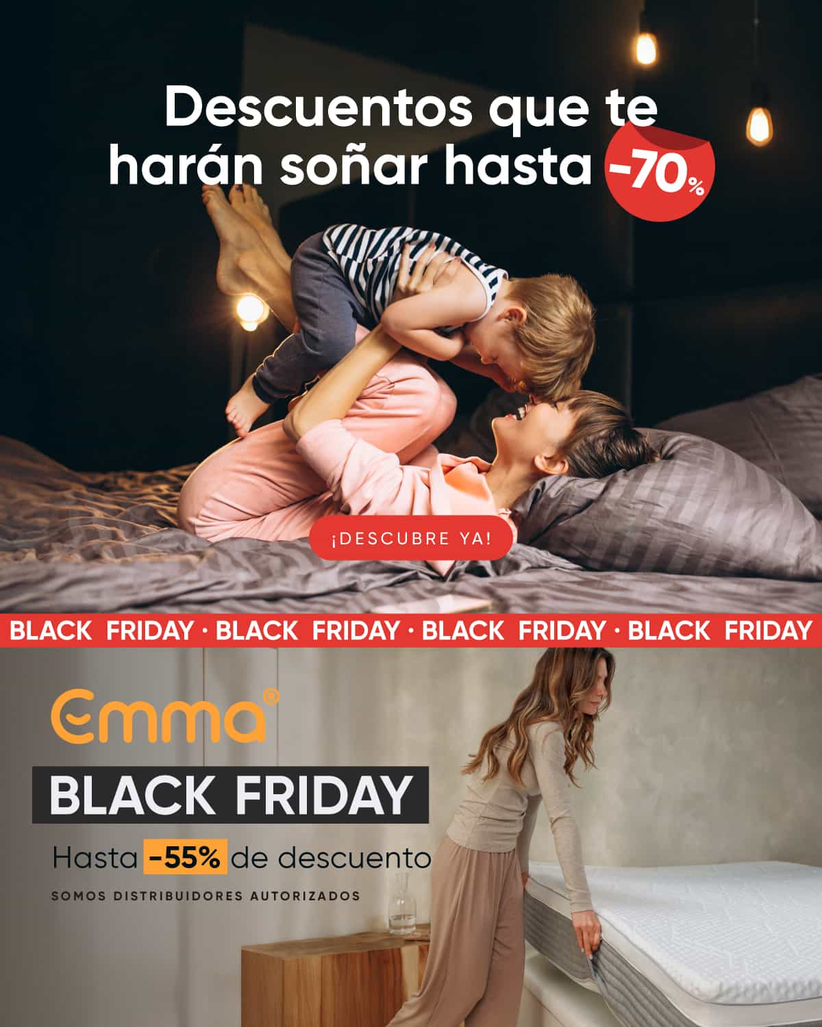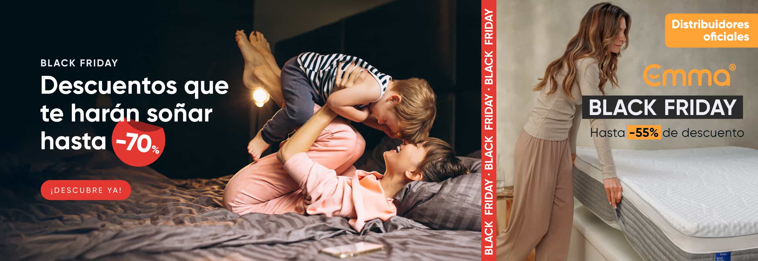 Este mes de noviembre, aprovecha el Black Friday y llévate hasta un 50%+10% en los colchones y packs canapé Zynia seleccionados, un 70% en el pack Berlín, hasta un 55% en colchones Emma, hasta 65% de descuento en Hukla, hasta un 60% en colchones Flex y un 10% de descuento en todo el catálogo de sofás.