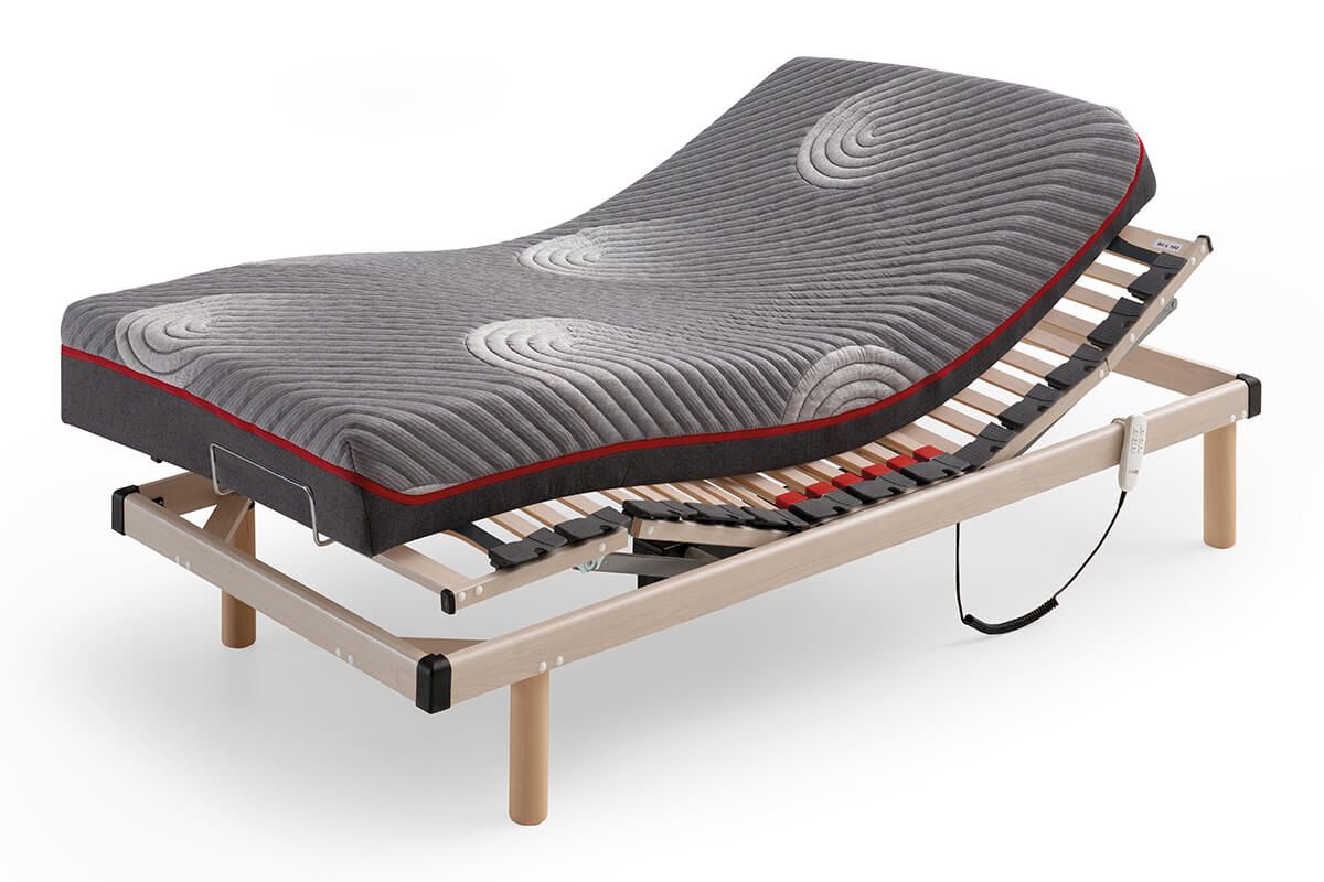 - Somier articulado Hukla Kronos-M: De estructura y láminas de madera de haya vaporizada y soporte para doble lámina especial en Hytrel elastómero indeformable con 12 tensores en la zona lumbar para ajustar la firmeza. Dispone de 5 planos de articulación que elevan el tronco y las piernas en vertical y en horizontal.